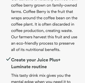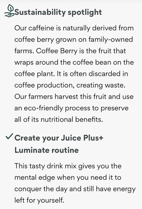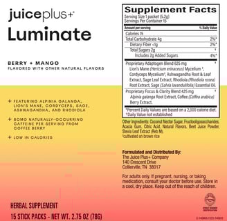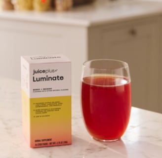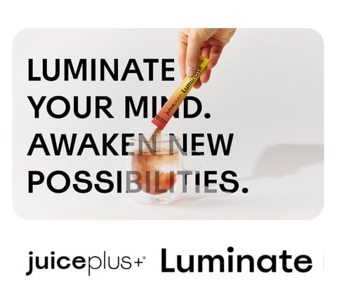 Juice Plus+ Luminate is a unique blend of plant-based ingredients, crafted to support your mental clarity, focus, and energy so you can accomplish more in your day.*